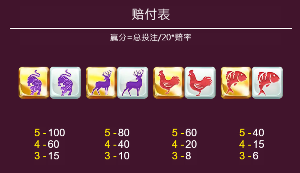 從賠付表上可以看出,每個圖案都有不同的賠付倍率,依據出現數量的多寡分為三、四、五個圖案的組合。例如,紫色的「老虎」圖案屬於高價值圖案之一,若達成五連線,將獲得高達100倍的賠付;而「鹿」的五連線則提供80倍的賠付。同時,「公雞」和「魚」的五連線雖然賠付較低,分別為60倍與40倍,但其頻率可能更高,讓玩家在持續遊戲中更容易獲得小額獎勵。
