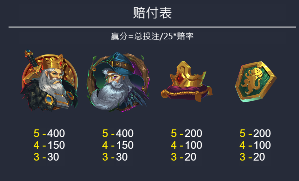 從視覺設計的角度來看,賠付表中金色與深色背景的搭配營造出一種奢華感,讓人仿佛置身於中世紀的宮廷之中。國王與法師的細膩刻畫、皇冠與盾牌的華麗設計,無一不強化了遊戲的王者主題。我覺得這樣的設計不僅吸引眼球,也讓玩家對遊戲內容充滿期待。