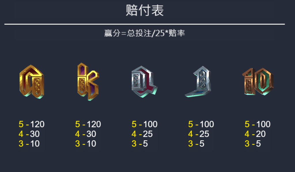 賠付公式清楚地標註在賠付表上:贏分=總投注÷25×賠率。我認為這樣的公式設計直觀且易於理解,特別適合那些對數字敏感但不喜歡複雜計算的玩家。通過這個公式,玩家可以輕鬆計算每一次旋轉可能帶來的回報,增強了參與感和策略性。