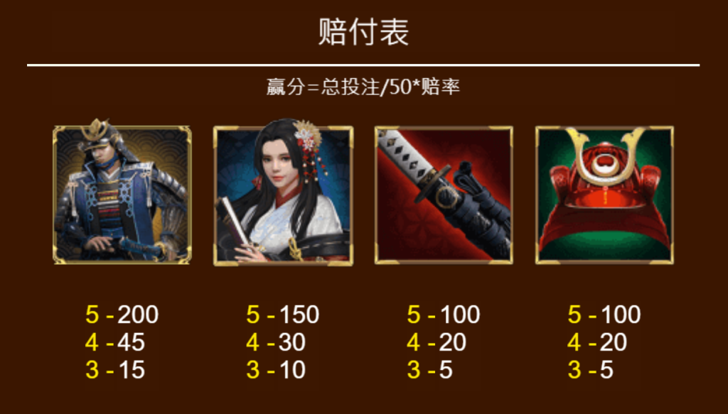 - 武士符號:作為遊戲中的核心符號,武士代表了最高的回報,當出現5個連線時,玩家可獲得200倍的投注回報。我認為這樣的設計充分體現了遊戲的主題,也激發了玩家對大獎的追求。