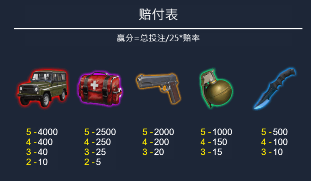 從賠付圖來看,高價值圖標包括軍車、醫療包、手槍、手榴彈和戰術匕首。其中,軍車是最具吸引力的圖標,五連賠付達到驚人的4000倍,顯示出其作為最高獎勵的核心地位。而醫療包和手槍的賠付也非常可觀,分別為2500倍和2000倍,讓人感覺這款遊戲的高價圖標分佈非常均勻。我覺得這樣的設計既有激勵性,也能避免玩家因高獎勵圖標難以出現而失去興趣。