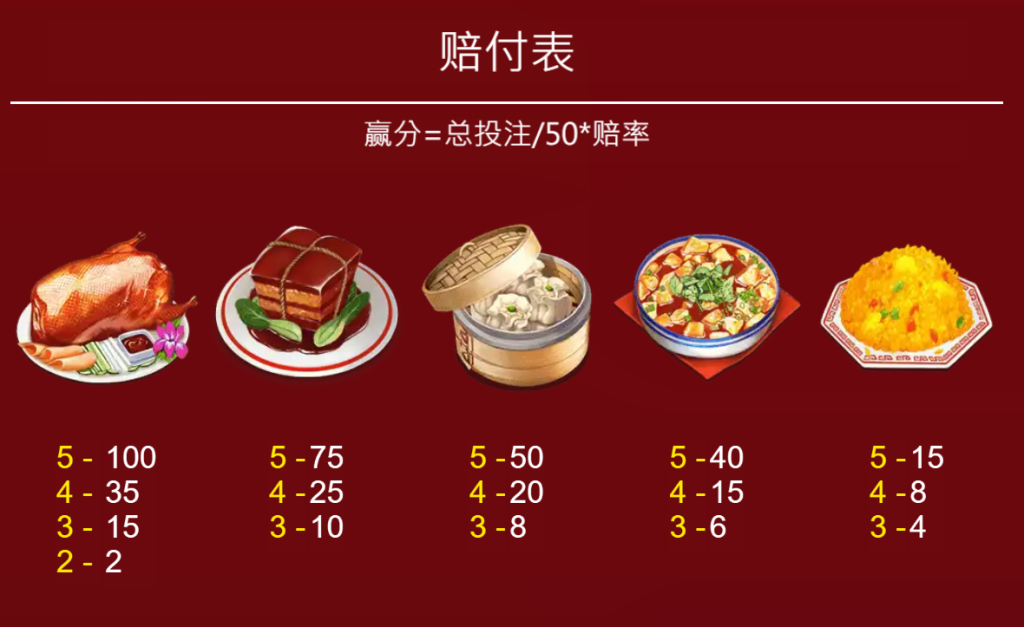 《小廚娘》的賠付公式非常簡單明了:贏分=總投注/50×賠率。這樣的設計讓玩家能清楚了解自己的每一次旋轉如何影響最終收益,增加了遊戲的透明性和公平性。