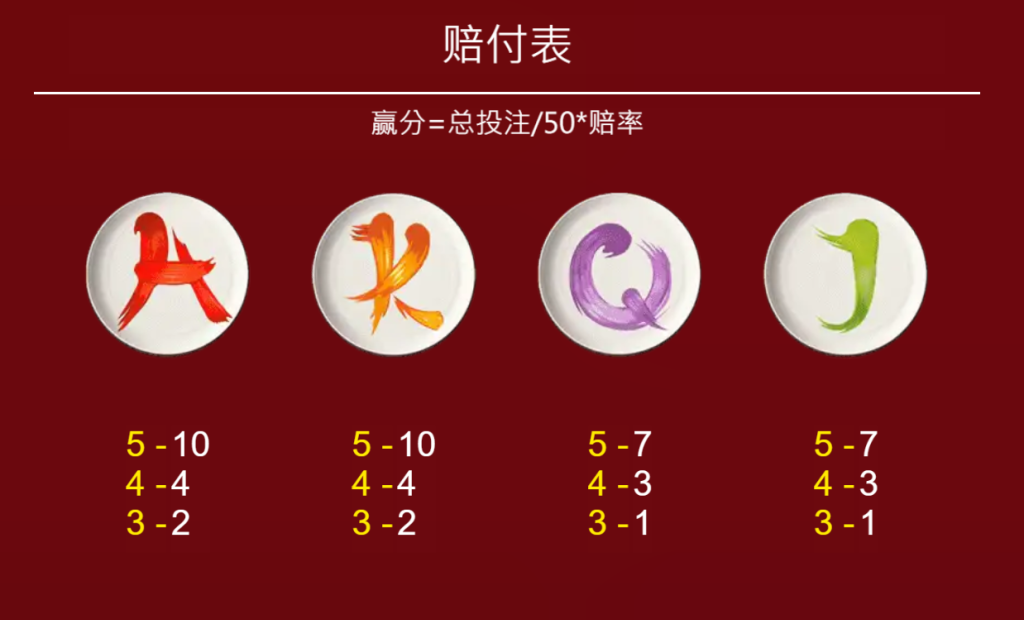 低價值符號則由盤子上的A、K、Q、J組成,五連賠付從10倍到7倍不等,儘管獎勵較低,但它們的高頻出現率能為玩家提供穩定的小額回報。我覺得這些符號不僅延續了經典遊戲元素,也在視覺設計上融入了中式書法的風格,增添了遊戲的文化韻味。