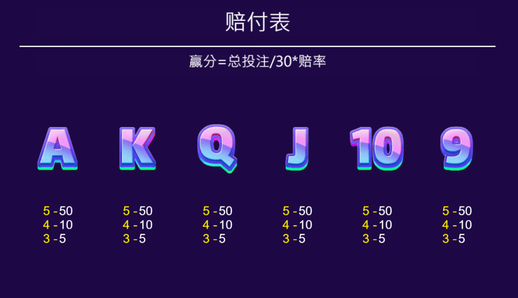 遊戲中的低賠率符號則包括「A、K、Q、J、10、9」等字母與數字符號。這些符號的賠付率最高為50倍,最低僅為5倍。我認為,這些符號的存在雖然無法帶來高額獎勵,但卻是玩家保持連續中獎的基礎,起到了調節遊戲節奏的作用。