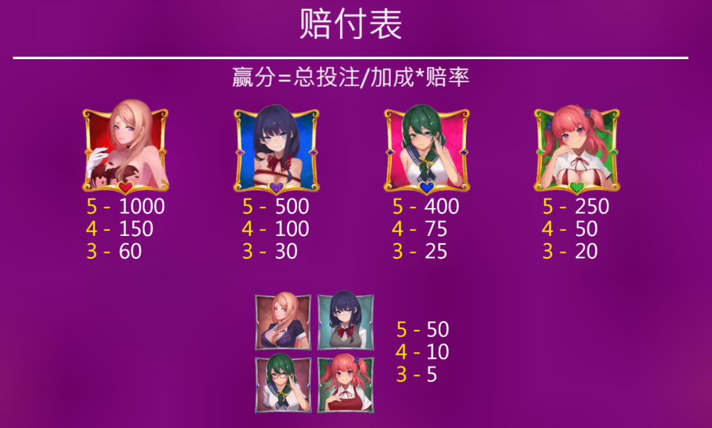 遊戲中具有四種主要妹子角色,分別對應不同的賠付等級: