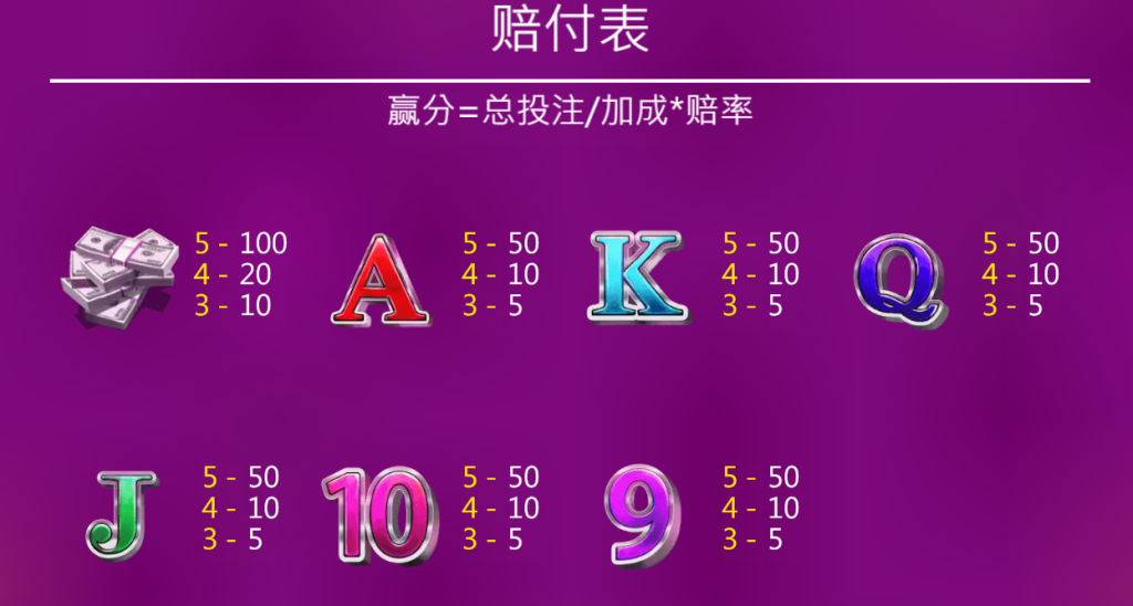 - 紙鈔圖標:小額獎勵的代表,最高賠付100倍。