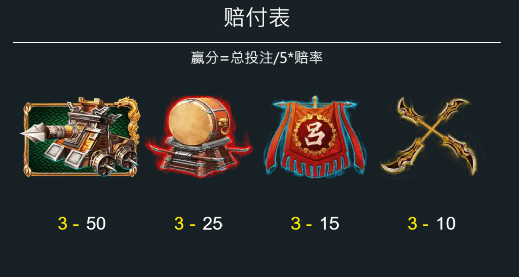 從賠付表中可以看出,《呂姬無雙》中最具價值的符號為戰車,當玩家同時轉出3個戰車符號時,能夠獲得高達50倍的賠付。我覺得,這種設定不僅大幅提升了玩家對高獎勵的期待,還讓遊戲更加充滿挑戰性。其次是大鼓符號,象徵著三國戰場上的號令,3個大鼓符號則可提供25倍的賠付。