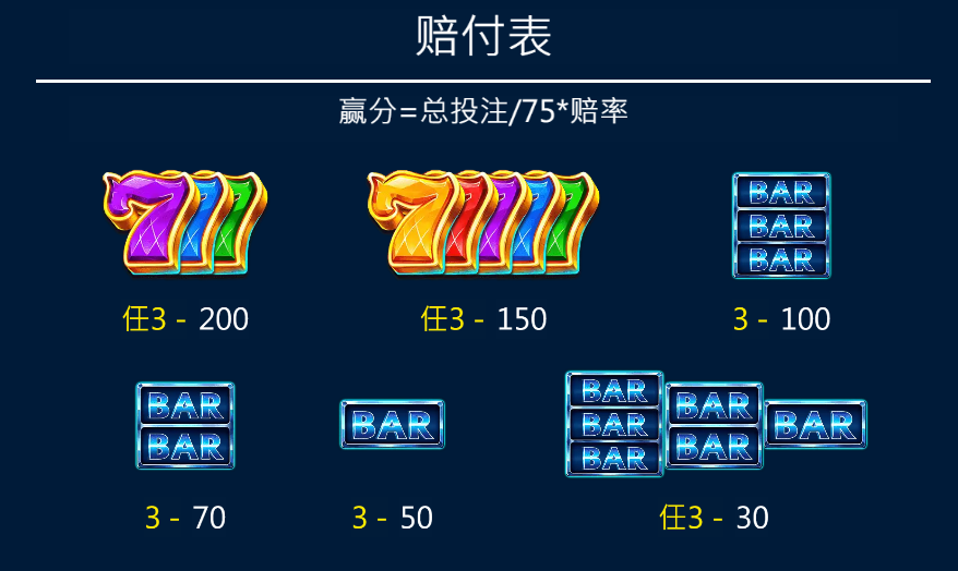 而在低額賠付部分,遊戲提供了「BAR」系列符號,從單一「BAR」到三連「BAR」的賠率範圍在30倍到100倍之間。我覺得這部分賠付設計非常人性化,給了玩家穩定的回報,同時降低了每次旋轉完全“落空”的風險。