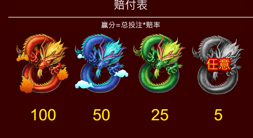 最後是「任意龍」符號的設計,當不同顏色的龍符號組成連線時,仍然可以獲得5倍的基本回報。我覺得這種設計非常人性化,降低了“空轉”的可能性,給了玩家更多中獎的機會,特別是在追求高額回報的過程中,這種小額回報的存在能夠有效緩解連續未中獎的挫敗感。