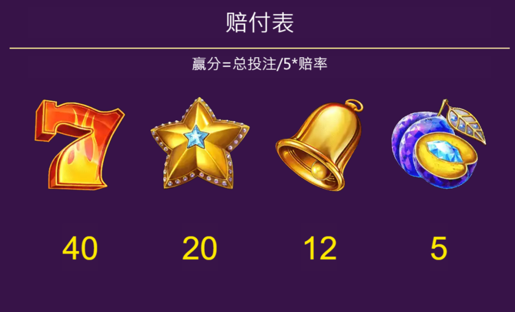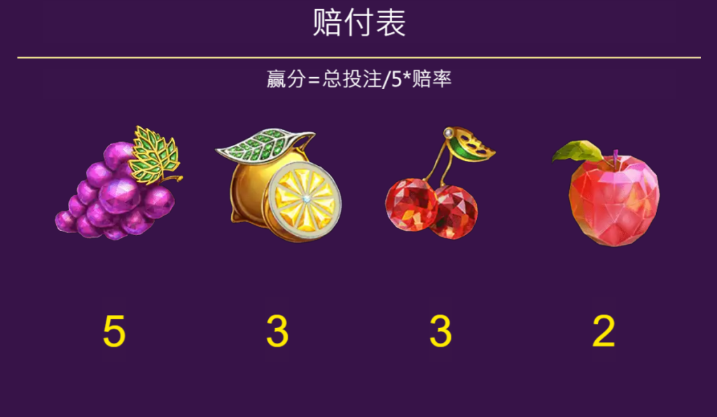除了高額符號外,遊戲中也有一系列閃亮水果符號,例如晶鑽般的「李子」、「葡萄」、「檸檬」和「櫻桃」,它們不僅美觀,而且出現頻率相對較高,帶來穩定的小額獎勵。葡萄和李子的賠付為5倍,而檸檬與櫻桃則提供3倍的回報。我認為,這些水果符號的存在讓遊戲不會因為追逐大獎而顯得太過緊張,反而在輕鬆中累積獎勵,增加遊戲的耐玩度。