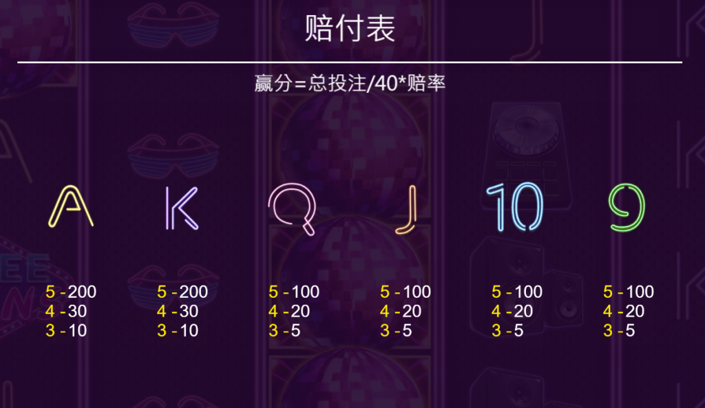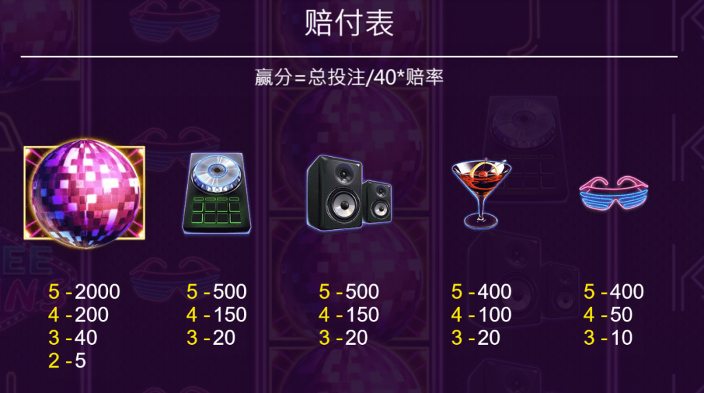 遊戲採用了40條中獎線的設計,大大增加了玩家中獎的機率。遊戲中的各個符號都極具夜店元素,例如炫彩迪斯科球、霓虹墨鏡、音響、DJ設備等,每個符號都閃耀著霓虹光芒,給人一種未來派對的科技感。其中,迪斯科球是遊戲中最具代表性的高賠付符號,當它堆疊出現時,將帶來巨額的中獎機會,讓派對的高潮瞬間引爆!