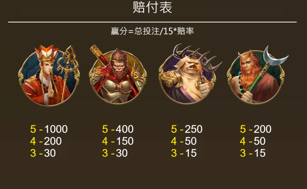 - 沙僧:作為夥伴,5個圖標也有200倍的回報,這樣的設計均衡了不同角色的獎勵分布。