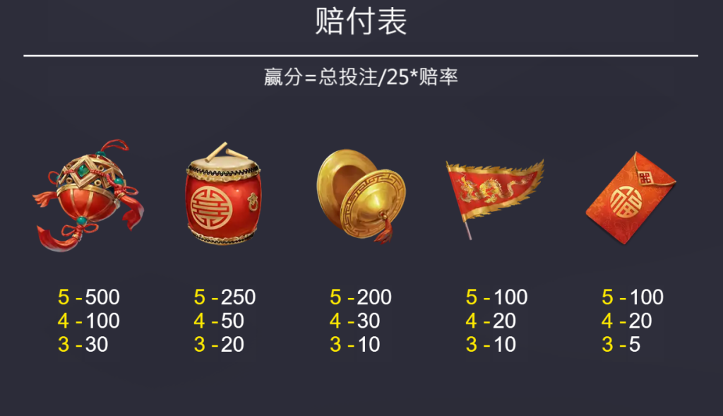 中等價值的符號包括「鼓」、「龍旗」和「燈籠」。這些符號的出現頻率較高,賠付也相對適中。我覺得這有助於保持遊戲的節奏,讓玩家在等待高價值符號的同時,仍能獲得穩定的獎勵,增加遊戲的持續性。