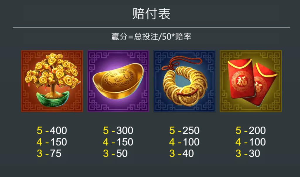 - 五個連線可獲得300倍的獎金,是僅次於招財樹的重要符號。