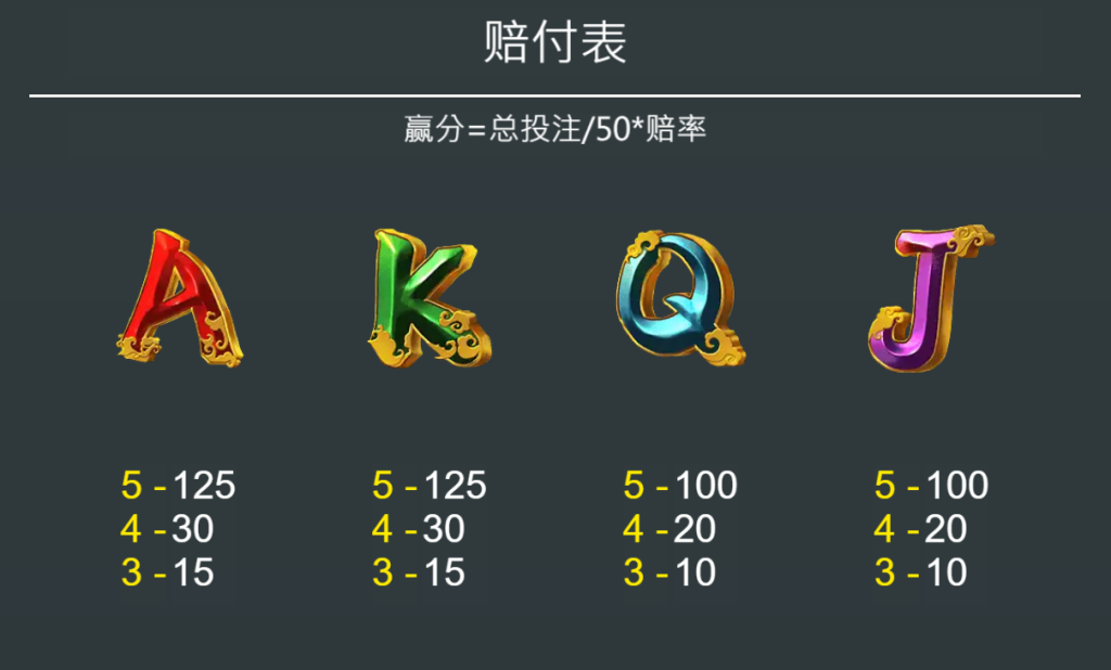 除了高價值符號外,遊戲中的「A、K、Q、J」字母符號,則帶來基礎賠付: