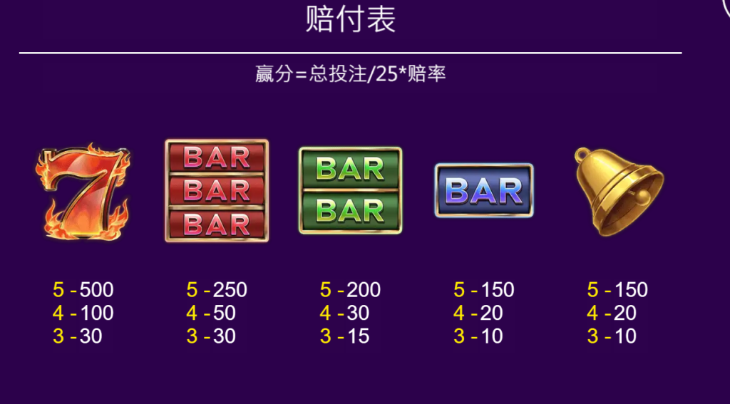 其次是紅色的「三層BAR」符號,5個排列時可贏得250倍賠率,緊隨其後的是綠色「雙層BAR」(200倍)和藍色「單層BAR」(150倍)。這些符號熟悉而經典,延續了水果機的傳統魅力,同時也提供了豐厚的中額獎金。