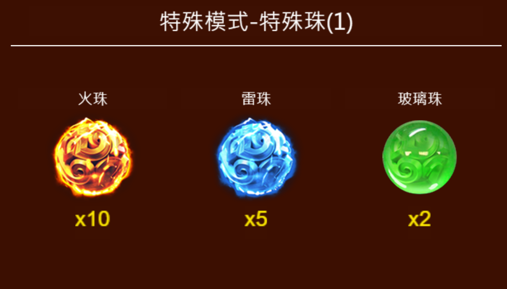 《雙獅戲珠》中包含三種特殊珠子:火珠、雷珠和玻璃珠,每種珠子都有不同的賠付倍率: