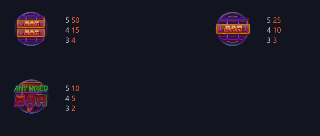 遊戲採用20條支付線,提供多重中獎機會,讓每一次旋轉都充滿期待。主要符號包括經典的「BAR」和「7」符號,特別是數字「7」不僅象徵幸運,還帶來高額賠付。而霓虹水果符號則頻率較高,幫助玩家穩定累積小額獎金。
