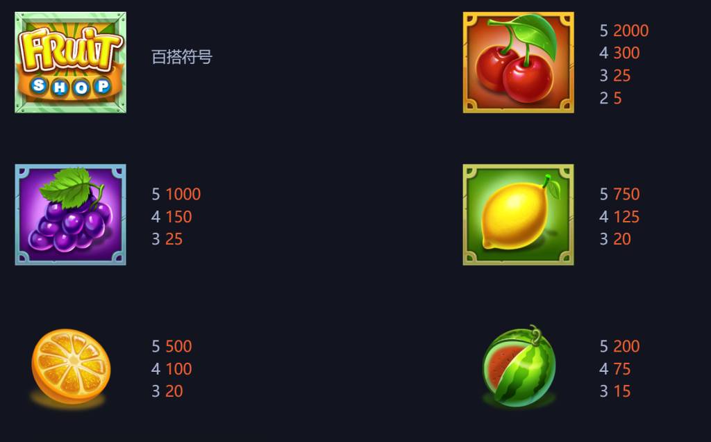 《水果超市》採用了可愛的水果主題,將葡萄、櫻桃、檸檬、西瓜等經典水果元素融入其中,配合鮮明的色彩和卡通風格的設計,為玩家營造了一個生動活潑的遊戲環境。不僅如此,遊戲中的水果符號各自對應不同的賠付倍數,其中櫻桃符號最高可達2000倍賠付,葡萄符號則提供高達1000倍的回報,讓每一次旋轉都充滿期待。