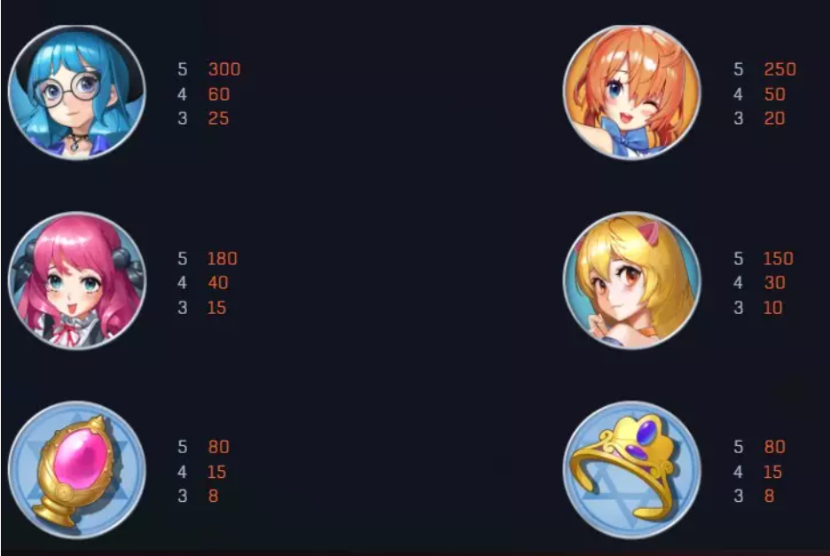 金髮貓耳魔法少女作為中高等符號,五個連線可獲得150倍的賠付。我認為她是遊戲中不可忽略的關鍵角色,經常出現,為玩家帶來穩定的獎金累積。