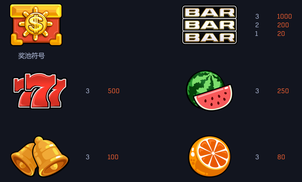 水果符號西瓜和橙子為遊戲增添了清新和色彩感。三個西瓜符號可帶來250倍的賠付,而三個橙子則提供80倍的回報。我覺得,這些符號的賠付倍率設計既豐富了遊戲的層次,又讓玩家在追逐高獎金的同時有更多的小目標可以實現,增加了遊戲的趣味性。