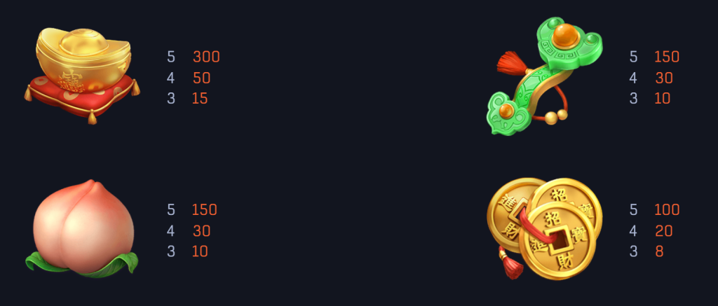 遊戲圖案設計細膩,包括金元寶、壽桃、金幣以及象徵吉祥如意的玉如意等,每一個符號都充滿濃厚的東方韻味。金色字母與數字圖案則增添了現代元素,為整體視覺效果帶來和諧的平衡。我認為,這樣的設計讓遊戲既保留了文化特色,又滿足了不同玩家的審美需求。