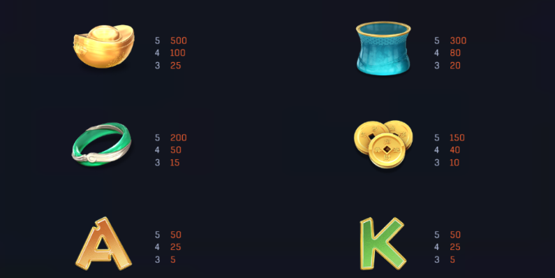 綠色玉鐲和金幣符號分別提供200倍與150倍的五連線回報。我認為,這些符號既美觀又寓意深刻,玉鐲象徵吉祥與平安,金幣則代表財運與收穫,這些符號的存在讓玩家在追逐高賠付時,也能收穫穩定的回報,增加了遊戲的持續性。