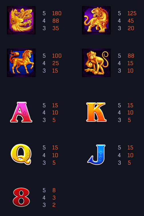 遊戲中的高賠付符號包括金龍、金虎、金馬和金猴,這些象徵力量、勇氣與吉祥的圖案不僅富有寓意,還提供了可觀的回報。例如,金龍符號在五連線時賠付高達180倍,金虎則提供125倍的回報。我覺得,這些高賠付符號的設計非常吸引人,尤其是對於追求高額獎金的玩家而言,每一次的出現都是一種期待與驚喜。