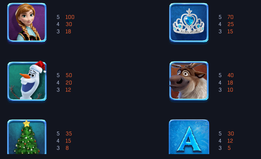 安娜是整個遊戲中最具價值的角色符號。當玩家連續轉出5個安娜圖案時,將獲得高達100倍的賠付。我覺得這設計不僅突出了主角的重要性,也為玩家創造了一個追求大獎的動力。而皇冠作為次高價值符號,五個連線可獲得70倍賠付,象徵著高貴與榮耀。我認為這兩個符號的高額回報,正是吸引玩家持續挑戰的重要元素。