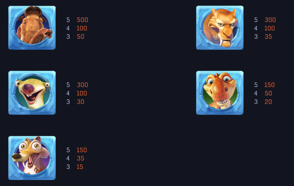 從賠付圖來看《冰川時代》中猛瑪象符號是獎金最高的,玩家只要連成5個,就能獲得500倍的獎勵,這不僅是一筆驚人的回報,更讓人感到振奮。其次是樹懶與劍齒虎,分別提供300倍和250倍的獎金,這些角色符號不僅回報豐厚,還喚起了玩家對經典動畫角色的情感聯結。