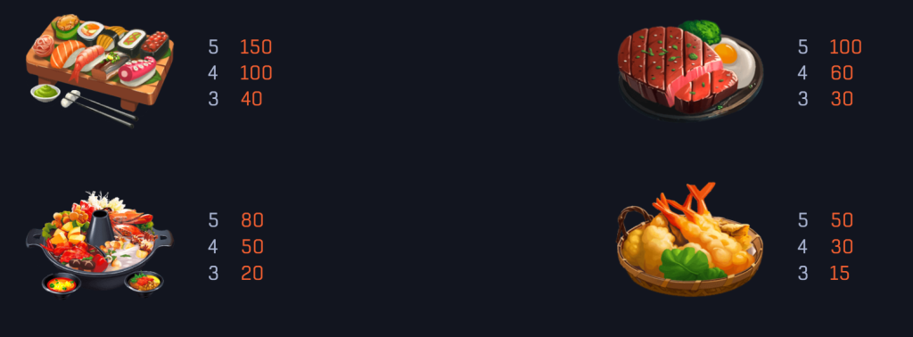 壽司拼盤的價值最高,集齊5個時可獲得150倍的回報。我覺得這不僅是對壽司精緻與多樣性的致敬,也是一種對玩家追求高額獎金的獎勵。接下來是多汁的牛排,湊齊5個時能帶來100倍的回報,這個符號彷彿提醒我們,享受一頓豐盛的晚餐同時也能贏得不錯的獎金。
