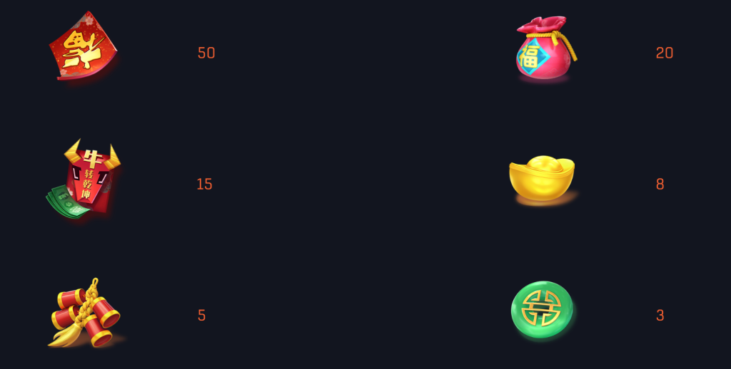 對於低賠付符號,鞭炮與綠色銅錢分別提供5倍和3倍的獎金。我覺得這些符號的存在是為了讓玩家在遊戲過程中保持連貫的獲勝體驗,即使是低額獎金也能帶來些許的滿足感,尤其是鞭炮的出現還營造了一種熱鬧的節日氛圍。