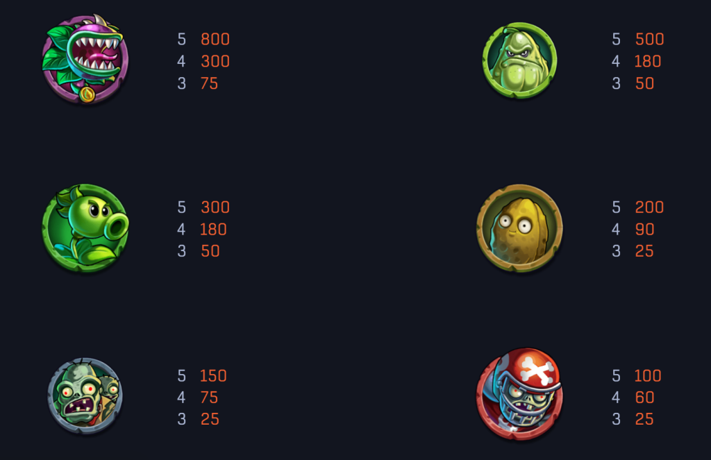 遊戲中最高賠付符號是食人花與西瓜投手,當湊齊五個食人花符號時,玩家可獲得高達800倍的獎金,而西瓜投手則提供500倍的回報。我認為,這些符號不僅代表了植物陣營中的強大角色,還讓玩家在追求大獎時充滿挑戰與期待。