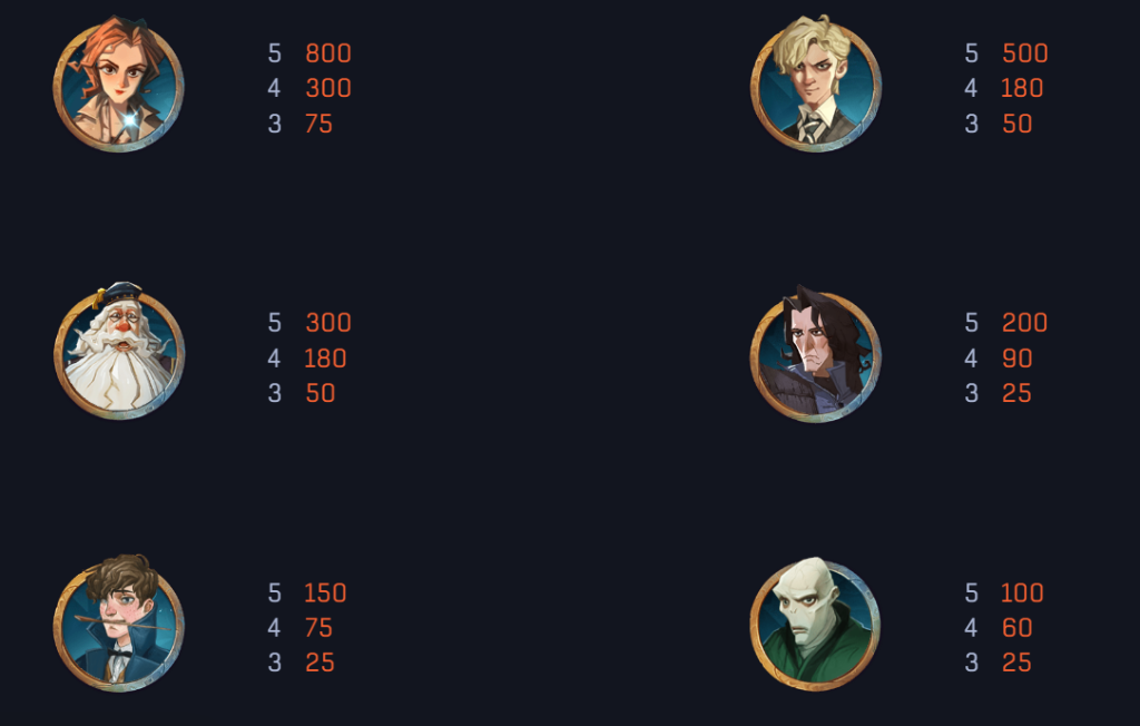 遊戲中的高賠付符號包括著名的魔法角色,例如赫敏、馬份和鄧不利多。赫敏作為最高賠付符號,當五個連線時可以獲得800倍的超高回報。我認為,這樣的設計不僅突出了角色的重要性,也為玩家提供了追求高額獎金的動力。