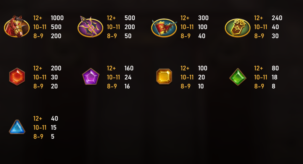 首先,我們可以看到圖表中的高價符號,像是呂布的坐騎「赤兔馬」和他的「方天畫戟」。這些符號不僅在視覺上氣勢十足,更是賠付圖中價值最高的符號。當玩家在遊戲中連線12個或以上的赤兔馬符號時,可以獲得高達1000倍的賠率!而方天畫戟則緊隨其後,12個以上可賠付500倍。我覺得這些高價符號象徵了呂布的力量與榮耀,玩家每次旋轉時都能感受到三國英雄的氣場。