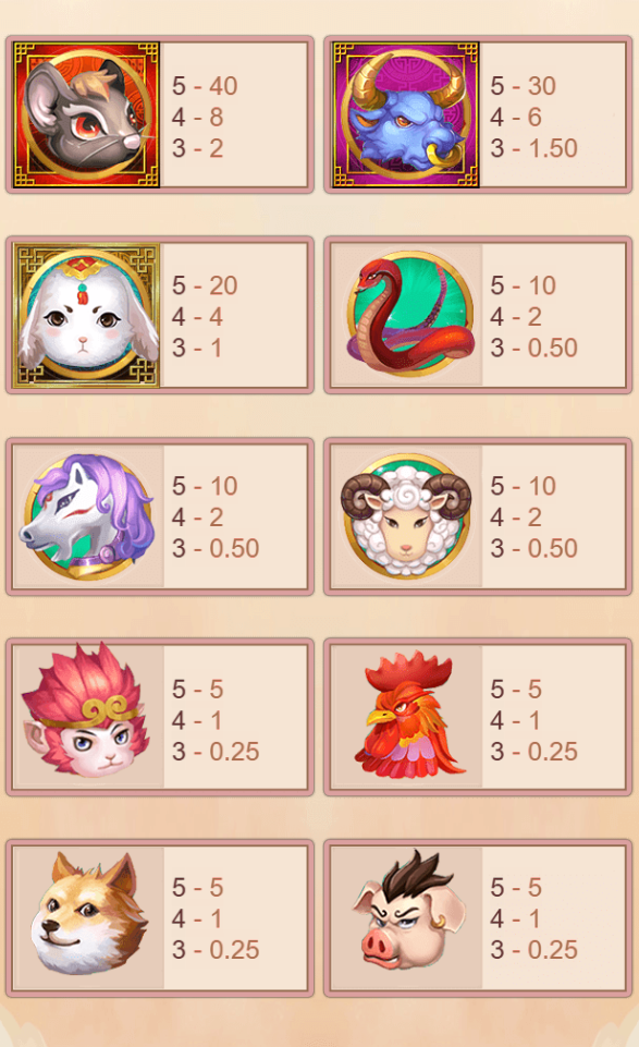 賠付圖中以鼠和牛作為高賠付的象徵,分別在5個連線時提供40倍與30倍的獎勵。我覺得這樣的設計不僅符合十二生肖中鼠和牛的勤奮寓意,也讓玩家在看到這些圖案時感到充滿期待。其次,兔子作為中等價值的符號,提供20倍的最高賠付,緊隨其後的是蛇、馬、羊,這些符號則以10倍的賠付為主。我認為,這樣的層次設計在保持平衡性上非常用心,既能提供高額獎勵,又不至於讓遊戲變得過於簡單。