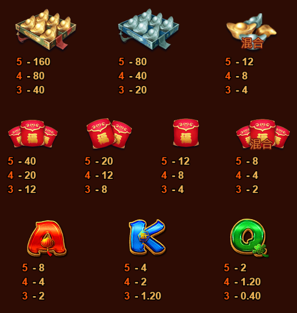 紅包符號是遊戲中的中等價值符號,分為多種形式,分別提供40倍、20倍和12倍的最高賠付。我覺得,紅包不僅是中國文化中象徵財運的經典符號,還讓玩家在遊戲中享受到傳統節慶的快樂氣氛。紅包混合符號雖然賠付稍低,但依然可以帶來穩定的小額獎勵,讓玩家在持續遊戲中保持樂趣和期待。