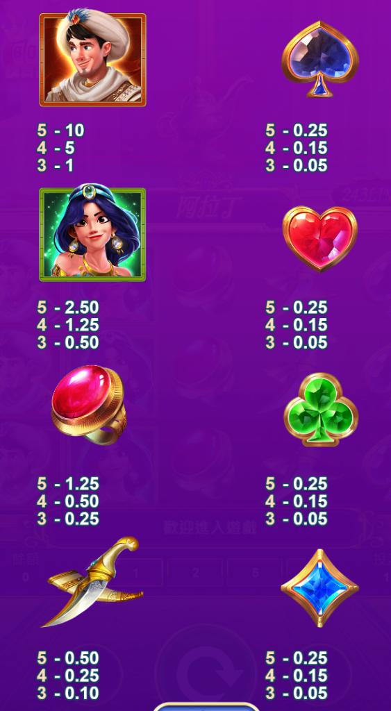 在《阿拉丁》中,最高價值的符號無疑是阿拉丁本人,其5個連線的賠付高達10倍。我覺得這樣的設計非常符合主題,作為遊戲的核心角色,阿拉丁應該擁有最高的回報,並且讓玩家在看到這個符號時充滿期待。其次是茉莉公主符號,作為阿拉伯童話中的另一個關鍵角色,茉莉公主的最高賠付為2.5倍,緊隨阿拉丁之後。我認為,這種高低搭配的符號賠付設計不僅合理,也增加了遊戲的層次感。