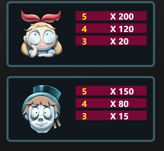 緊隨其後的是瘋帽子符號,5個符號連線時可提供150倍的回報,4個符號有80倍,3個符號則為15倍。我覺得這個符號不僅具有強烈的角色特色,還為玩家帶來穩定且誘人的回報。