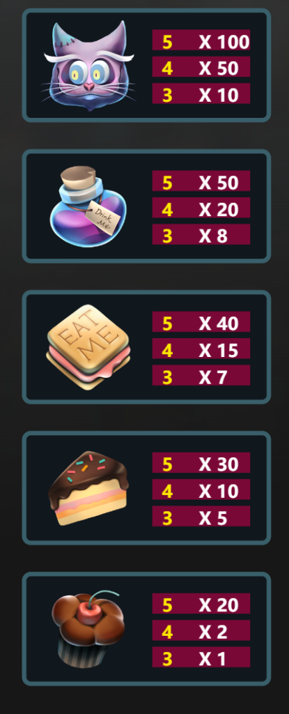 《仙境狂想曲》的賠付設計非常注重平衡,既有高額回報的核心符號,也有頻率較高的小額回報符號,滿足了不同玩家的需求。特別是高價值的金髮女孩和瘋帽子符號,為玩家提供了追求大獎的明確目標而中低價值符號則讓玩家能在遊戲過程中保持穩定的資金流。