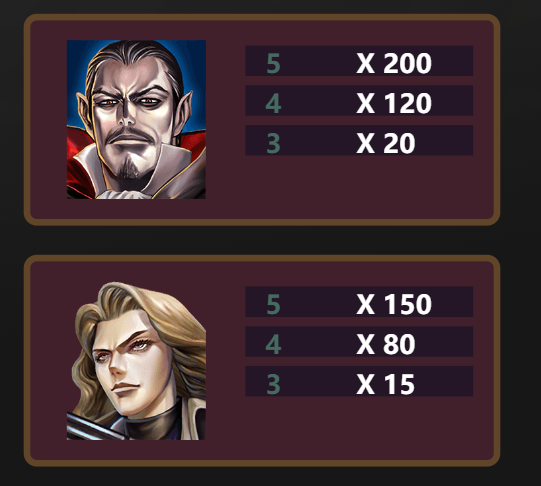 吸血鬼(X200)當玩家在同一條線上擊中5個吸血鬼符號,將獲得最高200倍的賠付。這是遊戲中的頂級獎勵符號,吸血鬼的冷酷表情與豐厚獎金完美結合,令人屏息期待。