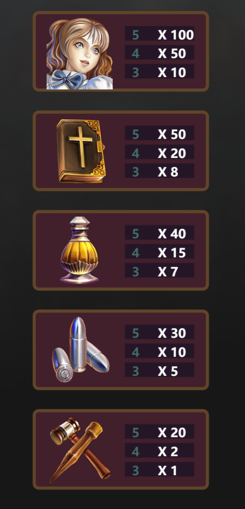 聖經與聖水(X50、X40)這兩個符號象徵著對抗黑暗的力量,分別能帶來不錯的回報,尤其是當連線達到5個時。