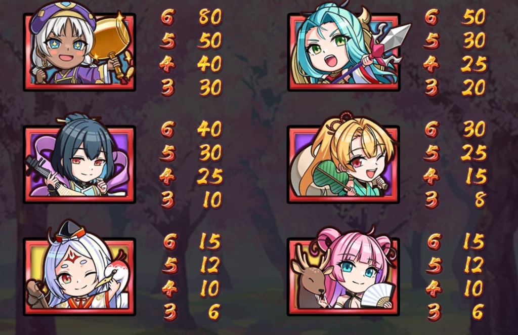藍髮與綠髮的福神分別是次高賠付符號,其6個符號的賠付倍率為50與40倍。而黃髮與紅髮的福神則是中等賠付符號,分別對應的6個符號賠付為30倍與15倍。我認為,這樣的梯度設計,能夠讓玩家在不同層級的收穫中找到樂趣。