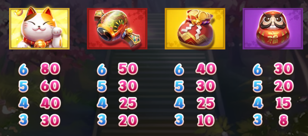 《招財喵》的主角招財貓是最高賠付的符號,當玩家獲得6個連線時,將可贏得高達80倍的獎金!這不僅象徵著財運亨通,也讓玩家在每一次的旋轉中都充滿驚喜。而接下來的紅色炮竹和金錢袋符號,同樣帶有濃厚的吉祥意味,分別提供最高50倍和40倍的賠付值。至於紫色達摩,更是為整體主題添加了一份祥和與趣味,其最高賠付達到30倍。