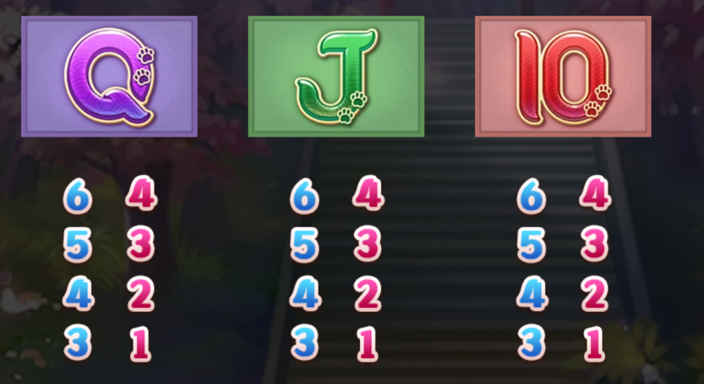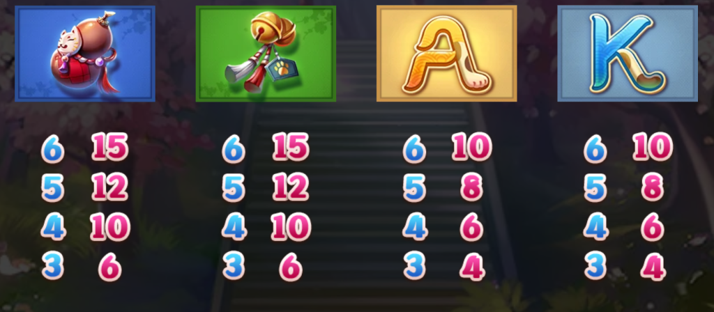 我認為遊戲的低賠符號也設計得相當精緻,比如藍色葫蘆和綠色鈴鐺,這些小巧的物品不僅搭配了可愛的動畫風格,還帶來了連線中的趣味性。就算是A、K、Q、J、10等字母符號,也因其融入了貓爪印記的細節,而不顯得單調,最高賠付為10倍或以下,適合提供玩家更多頻繁的小額獎勵。