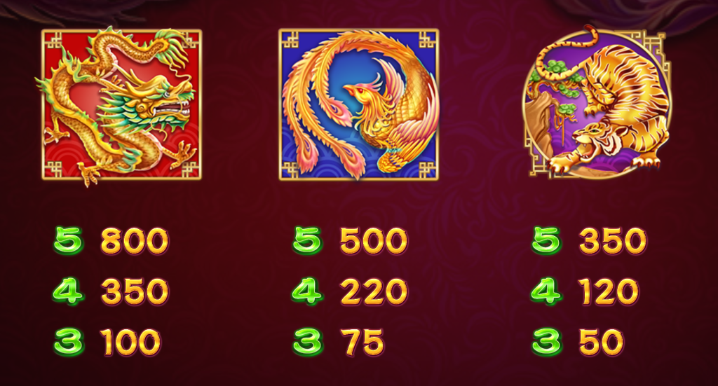 遊戲中的龍、鳳、虎三大高價符號,不僅以鮮明的設計展現了東方文化的威嚴與祥瑞,更代表了力量與富貴。龍符號的最高賠付達到800倍,讓玩家在贏得高額獎金時體會到如同龍飛九天的榮耀感;鳳符號的賠付為500倍,象徵祥瑞與繁榮;而虎符號的賠付則高達350倍,展現了威猛與力量的結合。我覺得這些高價符號不僅提升了遊戲的視覺吸引力,更讓玩家在追求高額回報的過程中充滿激情。