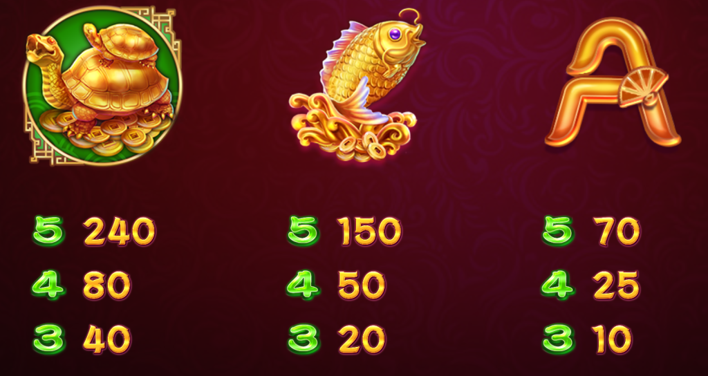 遊戲採用5軸3排設計,並提供243種贏取方式,讓玩家在操作上既簡單又充滿期待。高價符號包括金魚、金龜以及象徵力量的猛虎等,每一個符號都被精心設計,散發出濃厚的東方文化魅力。金色的符號更象徵財富與成功,讓玩家每一次旋轉都充滿驚喜。