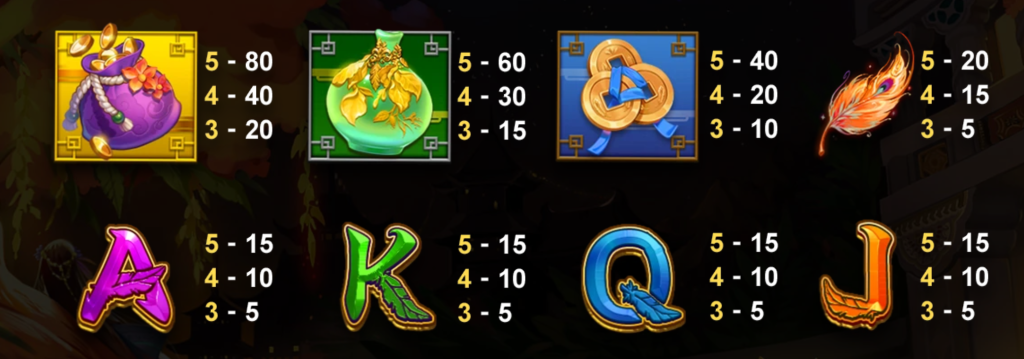 鳳凰羽毛圖案成為遊戲中的中等價值符號,其最大賠付為20倍。我認為這個設計巧妙地呼應了遊戲主題,象徵鳳凰的力量與靈性,帶來一種神秘的感覺。而低價值符號則包括了字母A、K、Q、J,它們的最大賠付均為15倍,儘管獎勵較低,但這些符號的頻繁出現能有效延續遊戲的節奏,給玩家更多期待。