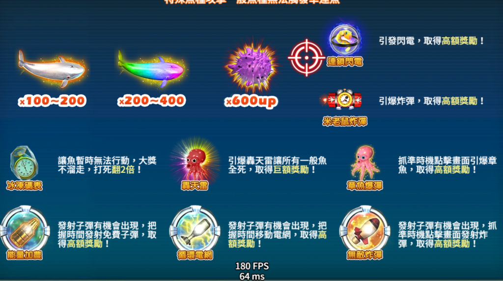 另外,「巨嘴怪魚」最高可達200倍,這些特殊魚種不僅為遊戲增添了挑戰,也讓玩家有機會在短時間內贏取豐厚獎勵。而那些較低倍數的普通魚種則適合積累點數,形成一種高低搭配的獎勵模式,既滿足新手玩家,也能吸引資深玩家挑戰更高目標。