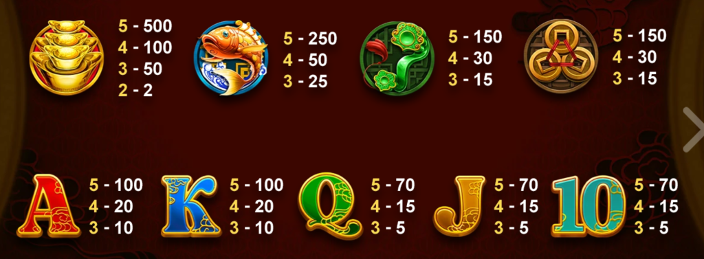 至於中等價值的符號,如綠色如意和金錢銅錢,最多可帶來150倍的回報,搭配著濃郁的中國風圖案設計,讓人不禁聯想到傳統文化中的吉祥寓意。而低價值的符號如A、K、Q、J和10,不僅為玩家提供了穩定的基礎回報,還透過鮮豔的色彩與細緻的圖案增添遊戲的視覺享受。